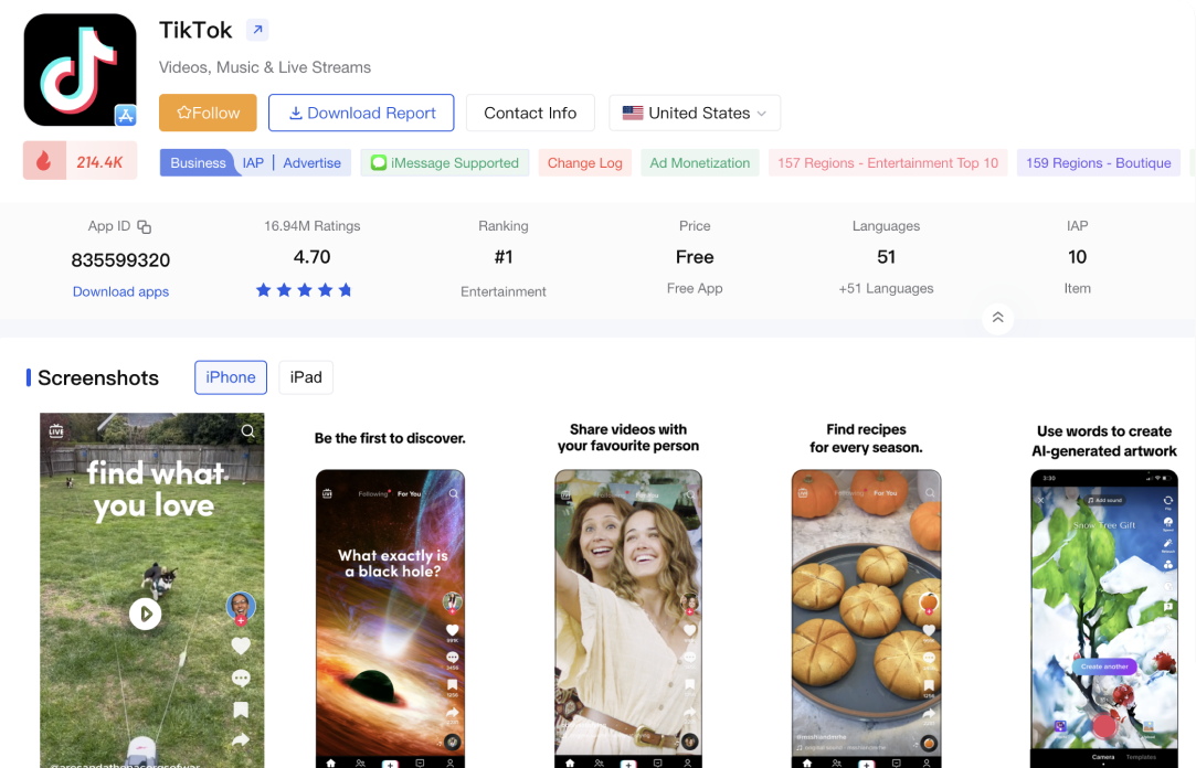 Get detailed data such as app’s active status, release date,update time, price, icon, screenshots, description, store link, etc.